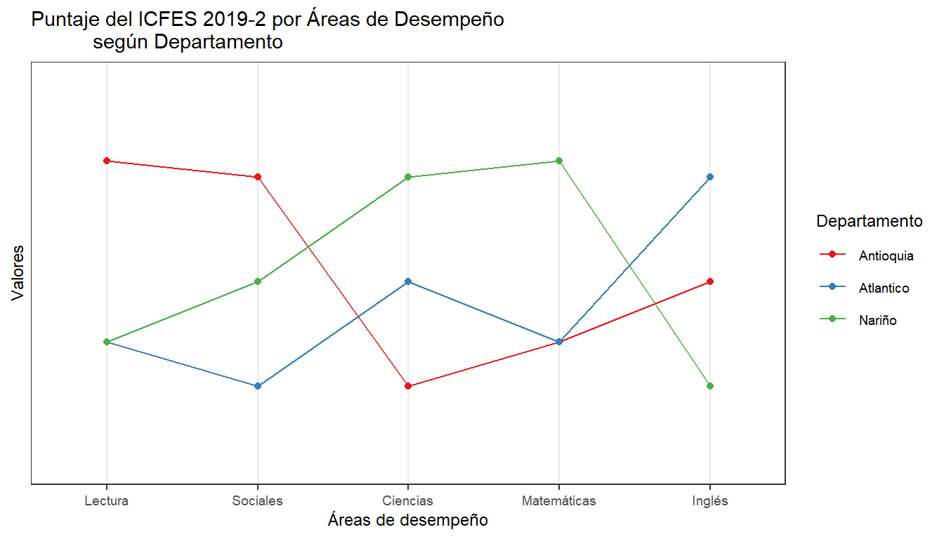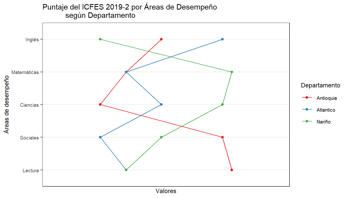 En las barras paralelas, se pretende comparar el valor de varias variables, no en el tiempo, sino según categorías. En el ejemplo las categorías son el departamento y las variables son el desempeño en diferentes pruebas de SABER11:
