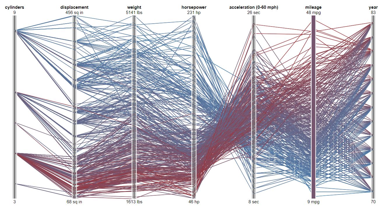 Spence (Spence 2007) expone esta visualización. Relata que en ocasiones presentan las coordenadas paralelas como una alternativa para visualizar la asociación entre variables diversas. Propone suponer un diagrama de dispersión entre kilómetros por galón y número de cilindros en los automóviles. Son solo dos variables. Nos propone imaginar una variante. Sean colocados de manera paralela los dos ejes y como marcas puntos ubicados sobre éstos. Para hacer evidente la asociación, se utiliza como canal líneas que unen los puntos que se corresponden en cada modelo de automóvil. El diagrama de dispersión es mejor para el par de variables, pero para más de dos variables, la alternativa es válida. Eso es lo que se denomina un Diagrama de Coordenadas Paralelas. Esa misma idea se puede lograr por medio del Diagrama de Araña o Radar, de hecho, son un Diagrama de Coordenadas Paralelas sobre coordenadas polares, por tanto, aplican las mismas restricciones expuestas en el capítulo correspondiente: problemas de aglutinamiento de líneas y de diferentes interpretaciones según el orden de las coordinadas paralelas. Entonces, ¿por qué se usan los Diagramas de Coordenadas Paralelas? Para identificar conglomerados de objetos. Evidencia la asociación entre individuos.