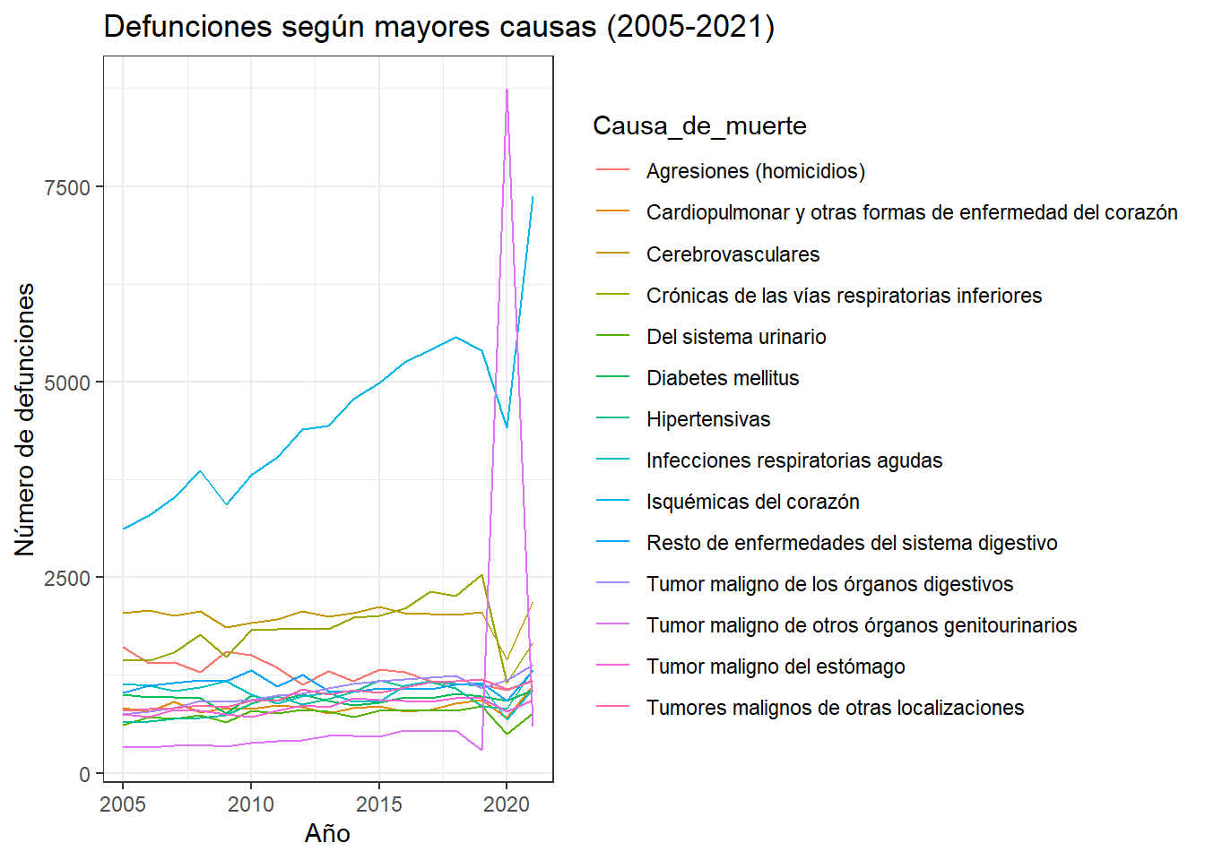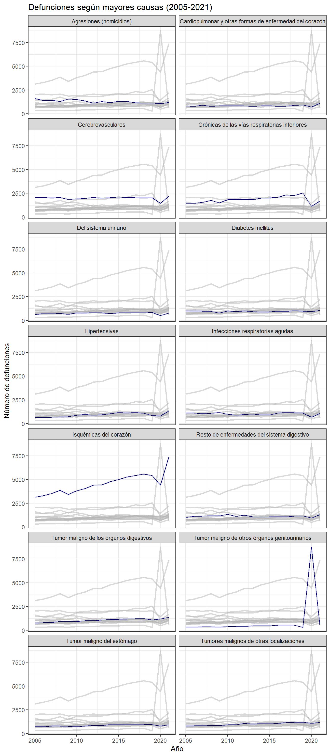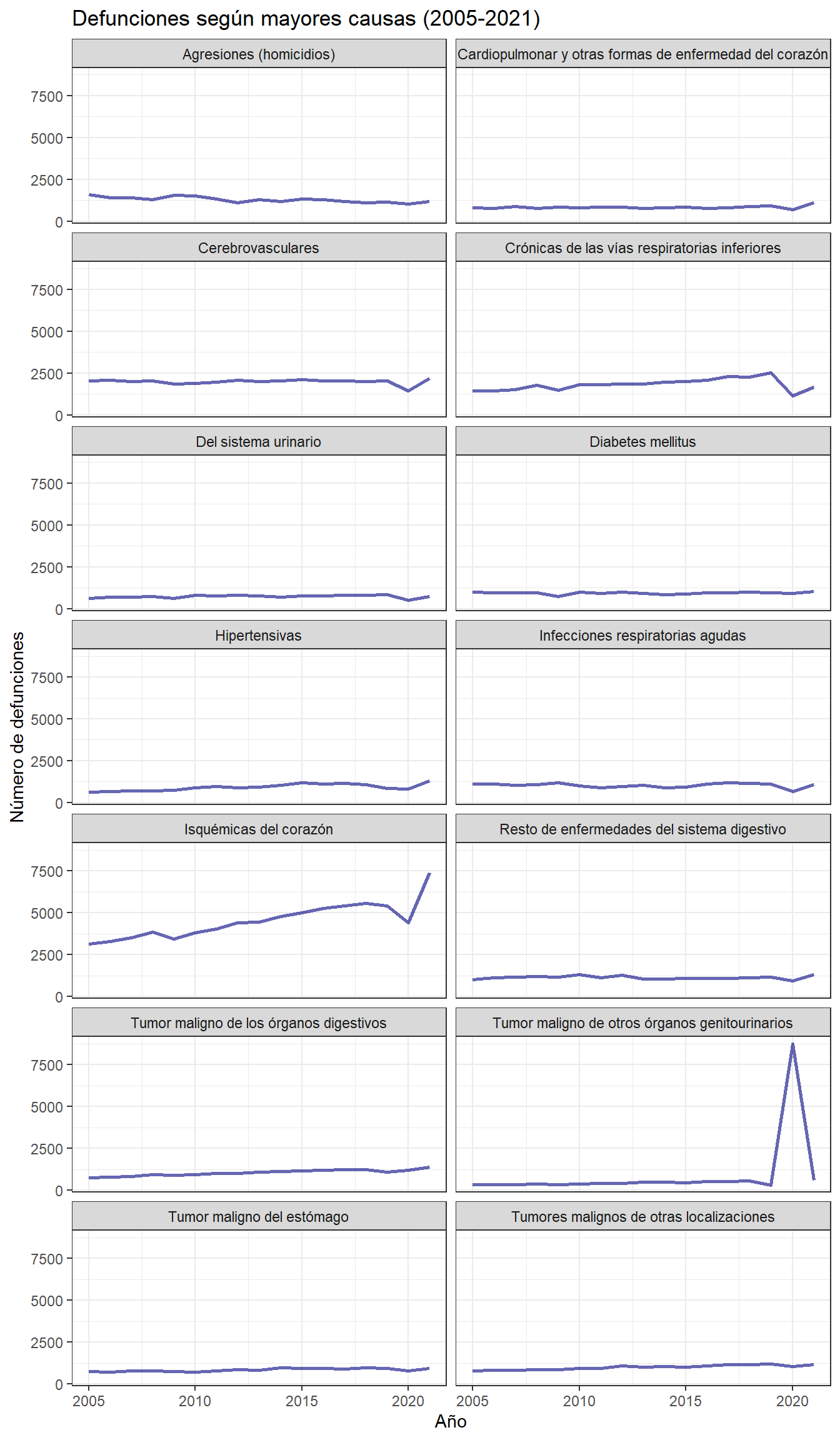 1. Usar múltiples gráficos: Estos se pueden usar para brindar información más detallada de todo el conjunto de datos. En el siguiente gráfico, es fácil vislumbrar la evolución de defunción de cualquier enfermedad: