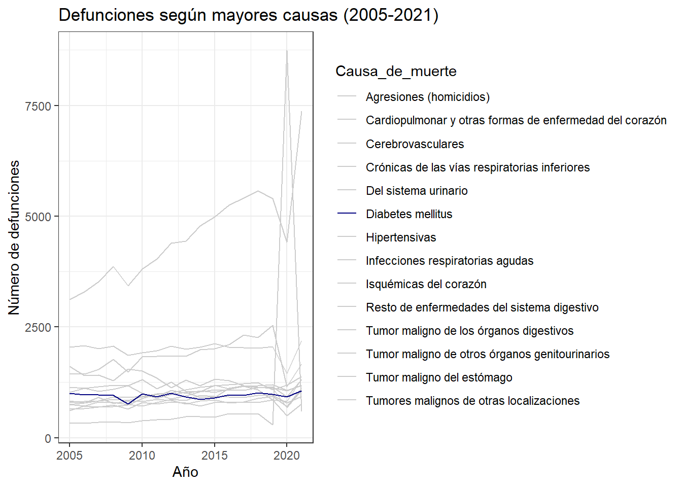 La evolución de las defunciones a causa de Diabetes Mellitus se resalta. Dejar las restantes líneas, permite realizar la comparación deseada.