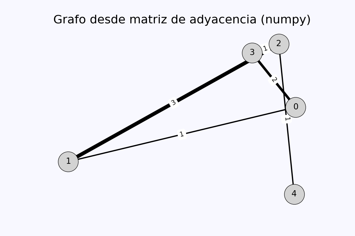 plt.title("Grafo desde matriz de adyacencia (numpy)")