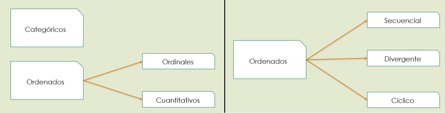 La dirección de los atributos es secuencial si tiene un valor mínimo y un máximo, divergente si de un punto inicial parten dos secuencias en direcciones opuestas, y cíclicos si al llegar a un punto regresa al punto inicial y continúa la secuencia. La siguiente figura presenta paletas de colores asociadas a cada tipo de datos ordenados: