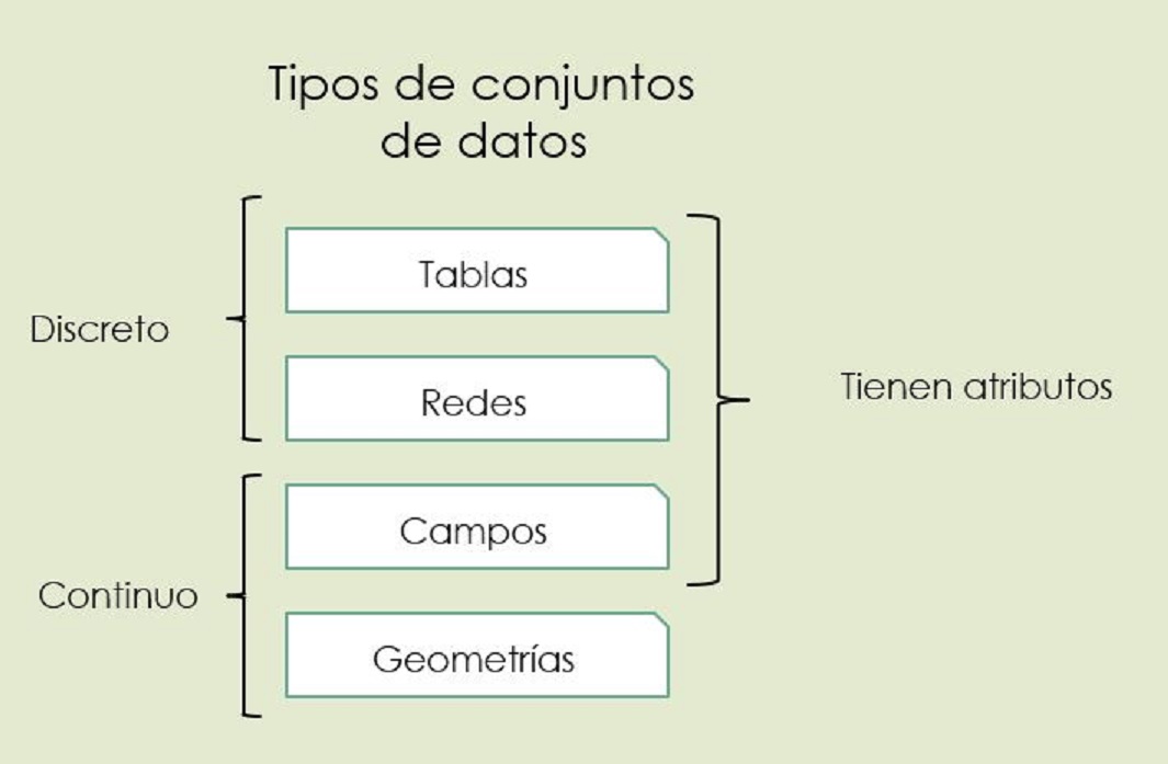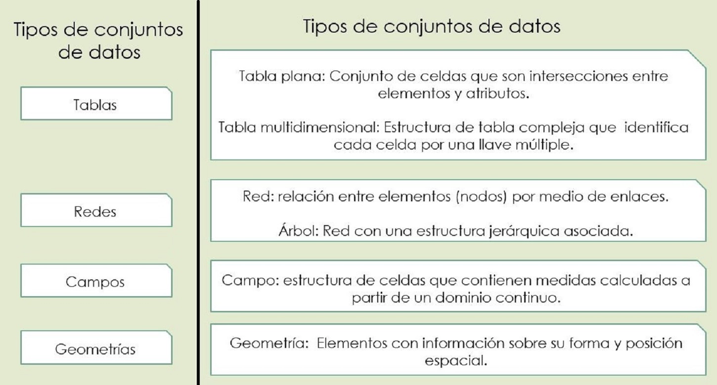 Hay cuatro tipos básicos de conjuntos de datos a visualizar: tablas, redes, campos y geometrías.