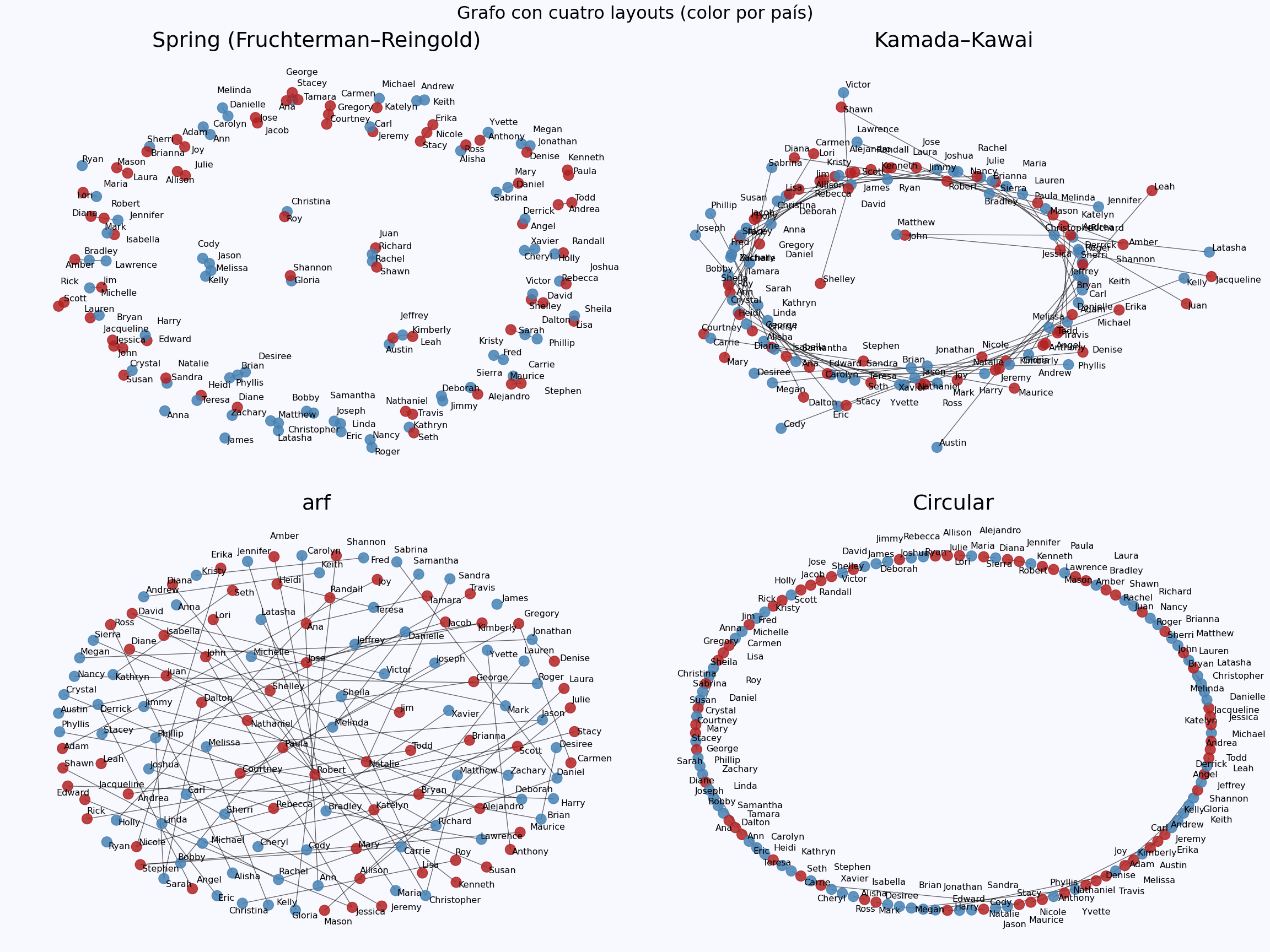 ## Text(0.5, 0.98, 'Grafo con cuatro layouts (color por país)')