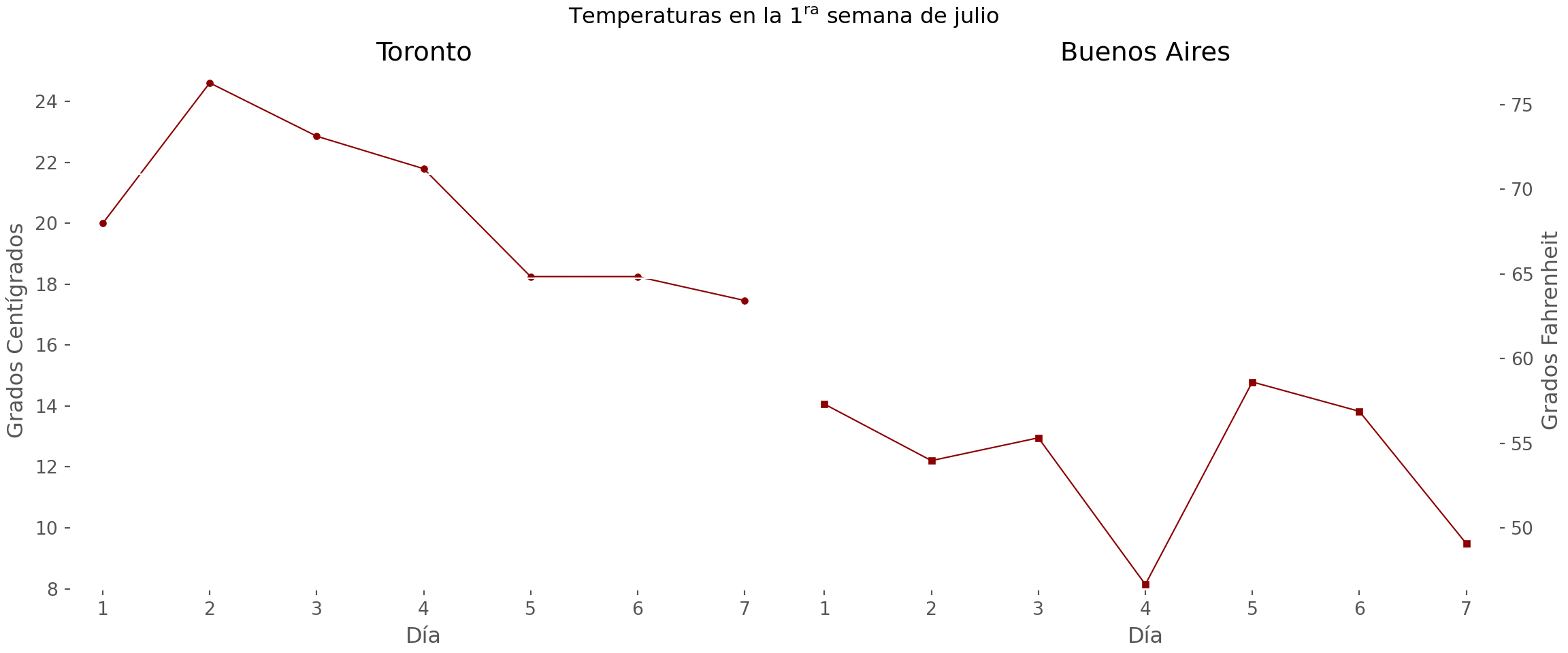 _ = fig.suptitle(r"Temperaturas en la 1$^{\mathrm{ra}}$ semana de julio")