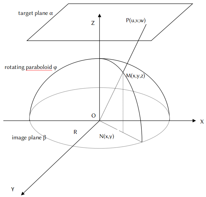 Imagínese que hay un conjunto de puntos ubicados sobre dicha cuadrícula hiperbólica. Considere ahora un plano cartesiano tangente a la base de la copa de champaña, es decir, tangente al punto (0,0). E imagínese un foco con rayos perfectamente paralelos al eje z. Permite realizar una proyección isométrica de las coordenadas de la cuadrícula hiperbólica sobre un plano cartesiano.